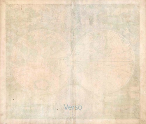In the corners are large and lively scenes allegorically representing the four elements, groups of figures between the hemispheres and, above and below them, two smaller polar maps.