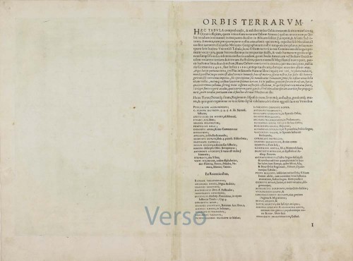 References: Van der Krogt 3 - 0001:31A; Van den Broecke - #1.1; Clancy - p.67 Map 5.9; Shirley (World) - #122 State 1; Karrow - 1/6; Meurer (Ortelius) - #1