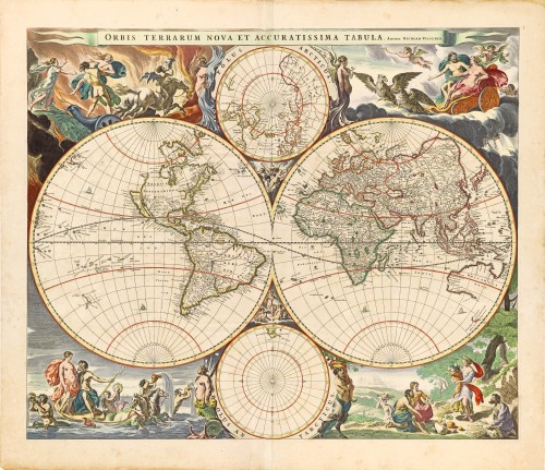 Antique world map - double-hemisphere by N. Visscher, with smaller polar projections at top and bottom and allegorical surrounds.