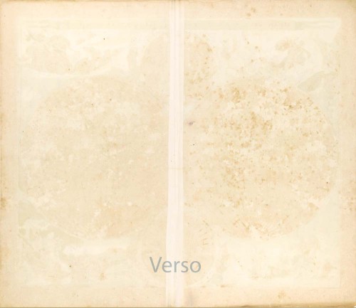 Nicolaas Visscher's new world map in two hemispheres can be regarded as the master forerunner of several highly decorative Dutch world maps produced throughout the remainder of the century. ... The distinctive attractiveness of many of the later seventeenth-century Dutch world maps is to be found in their border decorations, and Visscher's is no exception. His artist Nicolaes Berchem has introduced dramatic classical scenes representing the rape of Persephone, Zeus being carried across the heavens in an eagle-drawn chariot, Poseidon commanding his entourage, and Demeter receiving the fruits of the Earth. At the top and bottom are smaller spheres with projections based on the north and south poles; on the latter, only the tip of South America can be seen. (Shirley)