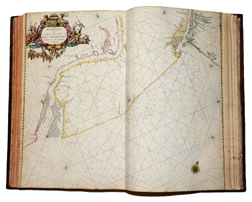 CONTEMPORARY HAND-COLOURED COPY OF THE ZEEATLAS, INCLUDING THE WORLD MAP AND THE 11 CHARTS OF THE AMERICAS. These include California as an island ('Paskaerte van Nova Granada en t'Eylandt California'; map 40), and the rare and very desirable Hudson River map ('Paskaert van de Zuydt en Noordt Revier'; map 34). This latter is omitted from later issues with 40 maps only. The text includes a short history of the origin and growth of navigation.