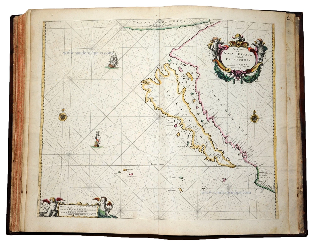 The standard form of the index calls for forty charts, but the Zee-Atlas was also available with forty-one charts, and indivudual examples of the various editions can be found with an additional chart, as here, which is the most desirable of the charts in the atlas. This additional chart, the "Paskaerte van de Zuydt en Noordt Revier in Nieu Nederlant", is the first printed Dutch sea-chart to focus on the Dutch possessions in New York, showing the Dutch colony of New Amsterdam with the settlements on Manhattan, Staten Island and Long Island, south to Delaware Bay and including the lower course of the Delaware River. Another important and famous chart in the volume is the "Paskaert van Nova Grenada, en t'Eylandt California", one of the two earliest Dutch printed charts to focus on the "island" of Califormia.