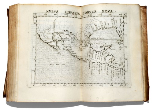 4to. Contemporary limp overlapping vellum (somewhat wrinkled), 3 parts in one vol., woodcut device on title and 64 double-page engraved maps after Gastaldi, numerous diagrams in the text.