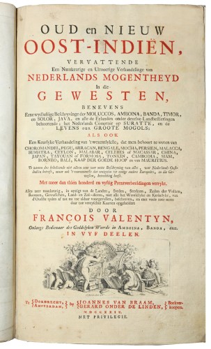 Valentyn F. Oud en Nieuw Oost-Indiën, vervattende een naaukeurige en uitvoerige verhandelinge van Nederlands mogentheyd in die gewesten, benevens eene wydlustige beschryvinge der Moluccos, Amboina, Banda, Timor, en Solor, Java, en alle de Eylanden onder dezelve landbestieringen behoorende (.). Als ook (.) van Choromandel, Pegu, Arracan, Bengale, Mocha, Persien, Malacca, Sumatra, Ceylon, Melabar, Celebes of Macassar, China, Japan, Tayouan of Formosa, Tonkin, Cambodia, Siam, Borneo, Bali, Kaap der Goede Hoop en van Mauritius.