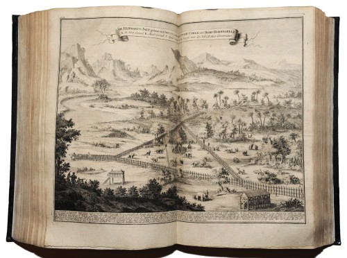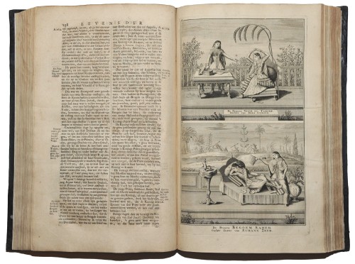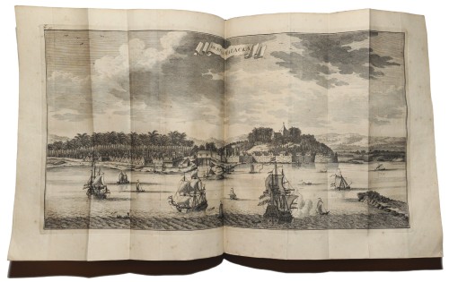 Dordrecht-Amsterdam, J. Van Braam - G. Onder de Linden, 1724-1726. 5 parts in 8 vols. Folio (34 x 22,3 cm), 19th cent. black half calf, gilt spines, engraved frontisp., portrait, 268 maps and plates of views, costume, natural history subjects, etc., and portraits of Dutch navigators and administrators, some double page, many folding + 84 textills. (incl. 3 woodcuts) + folded tables. Some library stamps, occas. waterstained in upper margin, some pages age-toned/ foxed. Overall a good set with some minor defects.