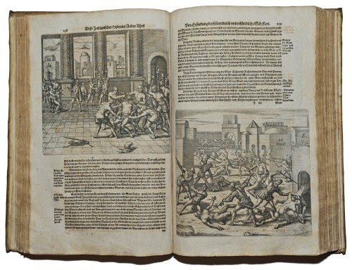 GOTFRIED J.L., Newe Welt und Americanische Historien. Inhaltende Warhafftige und volkommene Beschreibungen Aller West-Indianischen Landschaften Insulen Königreichen und Provinzen Seecusten fliessenden und stehenden Wassern Port und Anländungen. . . Deßgleichen Gründlicher Bericht von der Innwohner beschaffenheit Sitten Qualiteten. . . Item, Historische und Außführliche Relation 36. Fürnembster Schiffarten underschiedlicher Völcker in West-Indien Von der Ersten Entdeckung durch Christophorum Columbum biß auff dieses lauffende Jahr In 138 Jahren vollbracht. Mit zugehörigen Landtafeln Contrafacturen und Geschichtmeßigen Kupfferstücken zum Lust und Nachrichtung reichlich gezieret und verlegt.