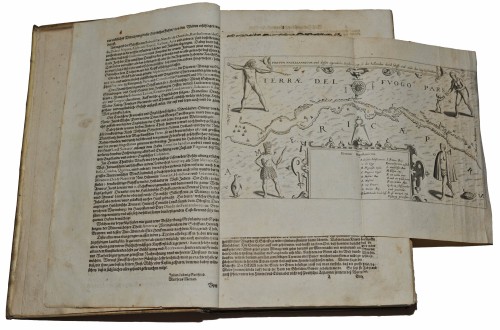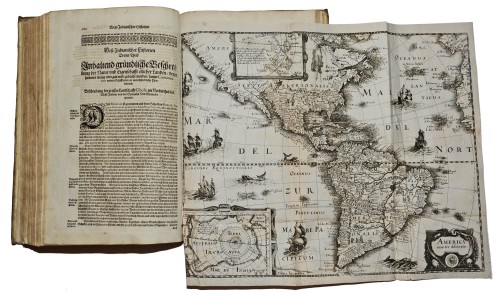 Franckfurt am Main, Merianischen Erben, 1655. Folio. Engraved printed title. 661pp, 1p. 5 folding maps, including the very important Virginia map by Schmidt (Burden, 219), a map of the Americas (Burden, 235), and 174 plates in text. (33,5 x 21 cm). Contemp. vellum, some soiling, engraved title page: upper right corner is torn off, not affecting the image, a few tears, backed. A few leaves with repaired tears. Good copy.
