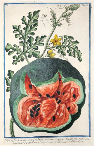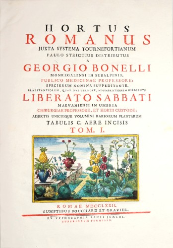 Hortus Romanus was brought out in eight volumes (1772-93). Actually, Bonelli seems to have been responsible for vol.I only. Then Niccolo Martelli, physician and professor of botany, took over. The flowers and vegetables in the plates were painted by Cesare Ubertini and engraved by Maddalena Bouchard, although one doubts that all eight hundred plates, over a period of twenty-one years, were prepared by the two alone.