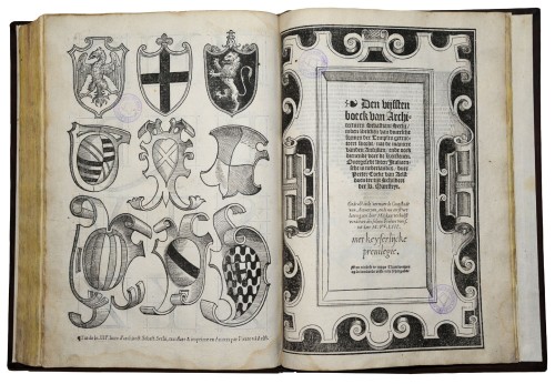 Book I - II: 42p including title page and illustrations. The first Flemish edition of Serlio's Book I - II. The woodcuts of this edition, many in reverse, were copied from the undated Venice edition, and were in turn used in the Amsterdam 1606, Basel 1608, and London 1611 editions. Both titles are within a woodcut strap-work border, the first copied in reverse by Pieter Coecke van Aelst from the original French plate, with a lion's head in place of the salamander.