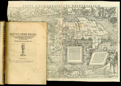Adams H.M. G-1334; Sabin (America) 34100; STC German, p. 375; Shirley (World), 67. First edition of one of the earliest compendiums of travel and exploration, composed by John Huttich and published by S. Grynaeus; with 17 accounts on the discoveries in America and Southeast Asia by Marco Polo, Christ. Columbus, Amerigo Vespucci, Fernando Cortez, etc. It contains also the famous report of Petrus Martyr on America: De insulis nuper repertis liber. It includes also the very important worldmap in oval projection, attributed to Hans Holbein the Younger and Sebastian Munster.