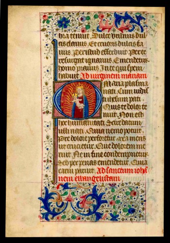 Illuminated miniatures, historiated initials surrounded by borders on three sides: Virgin and Child [On verso:] Feet with wounds, from a Book of Hours, Ghent, c. 1460.